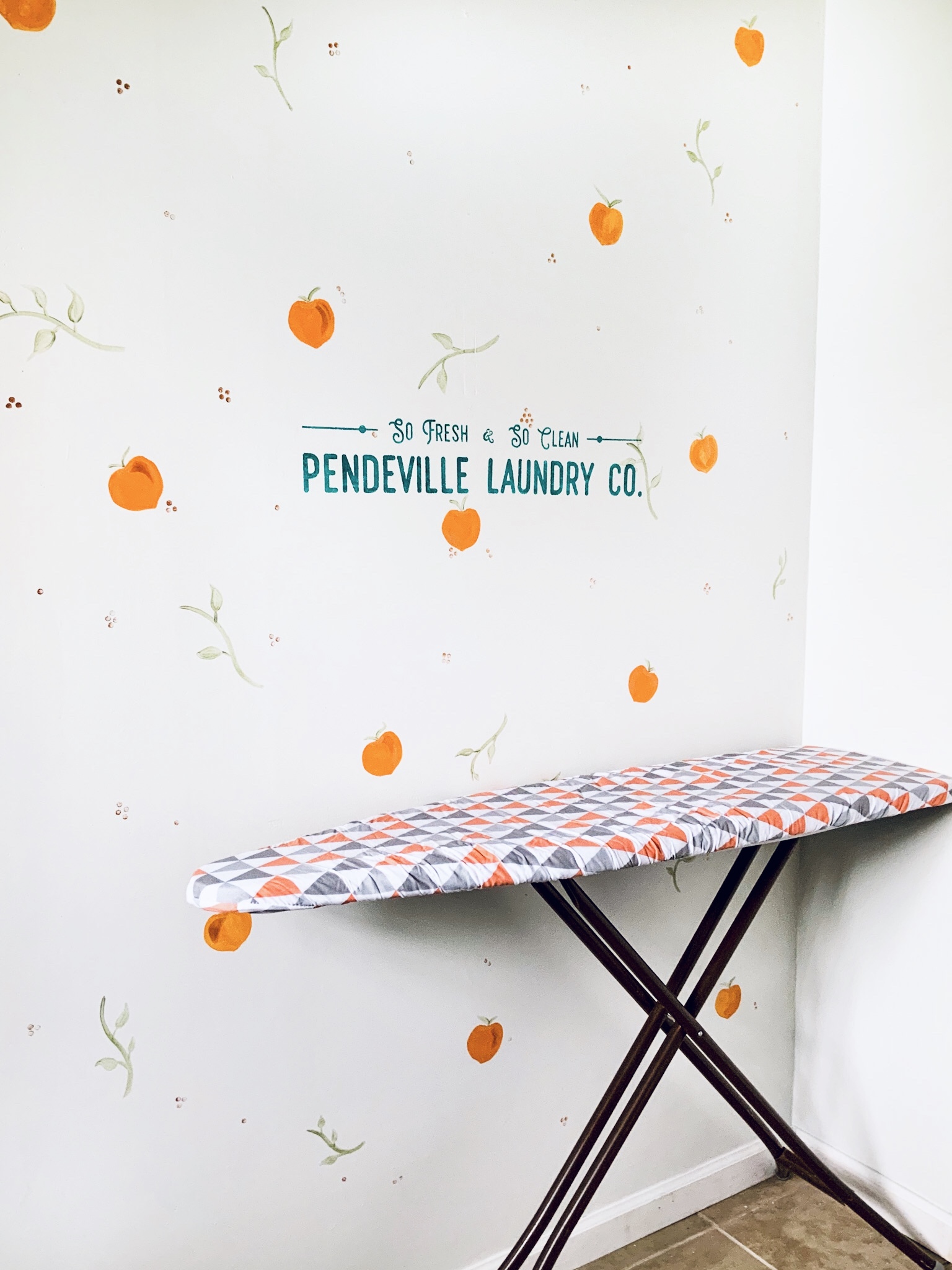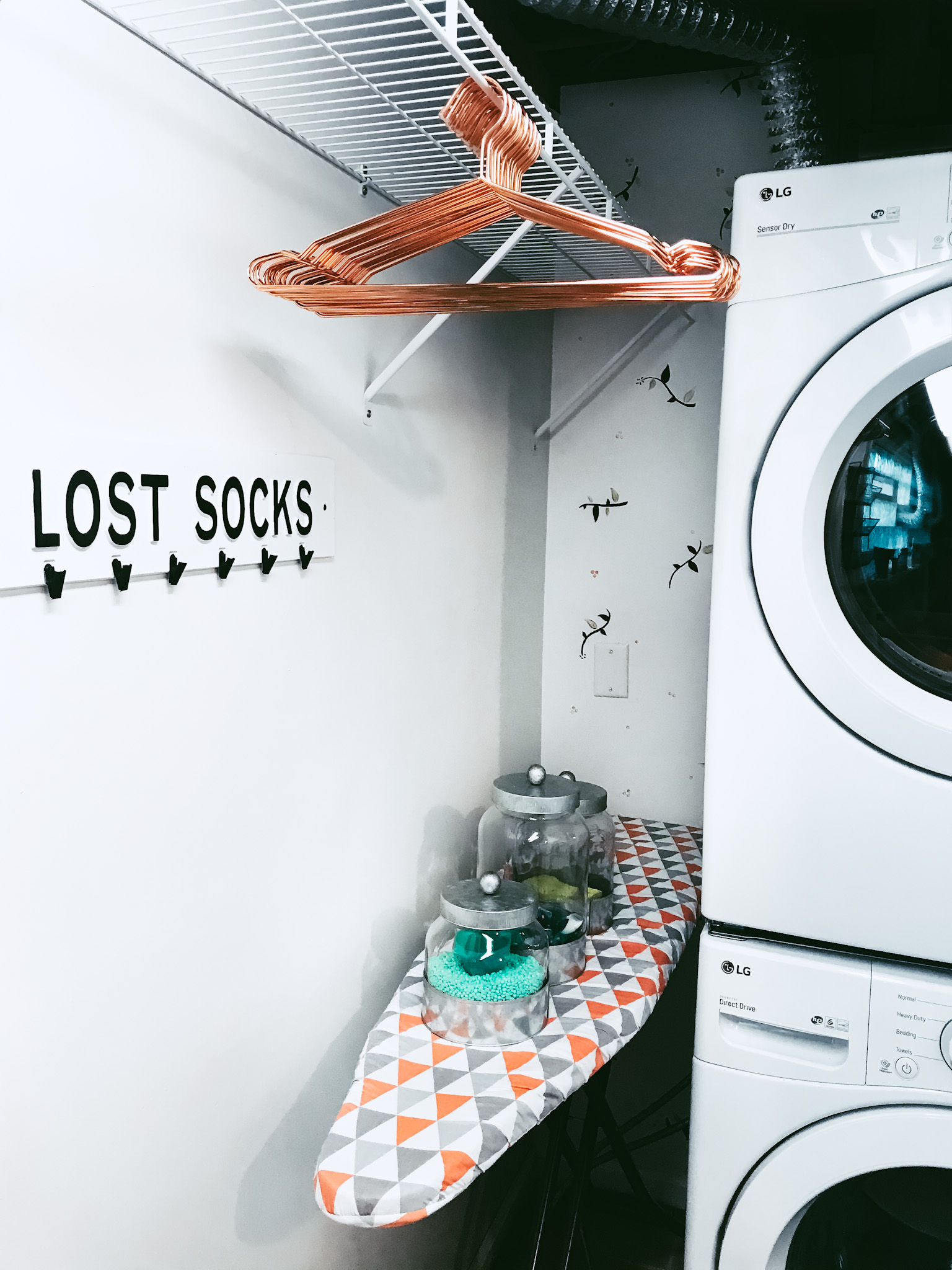 Links to Laundry Room Decor: Copper Hangers, Ironing Board Cover, Galvanized Metal and Glass Canisters, Wall Design Paint Set, Paint Brushes, Sponges (I painted our Pendeville Laundry Co. with), Lost Socks Sign, Downy Unstoppables In-Wash Scent Booster Beads, LG Washer, LG Dryer, Decal Maker (Cricut Maker), Cricut Tools