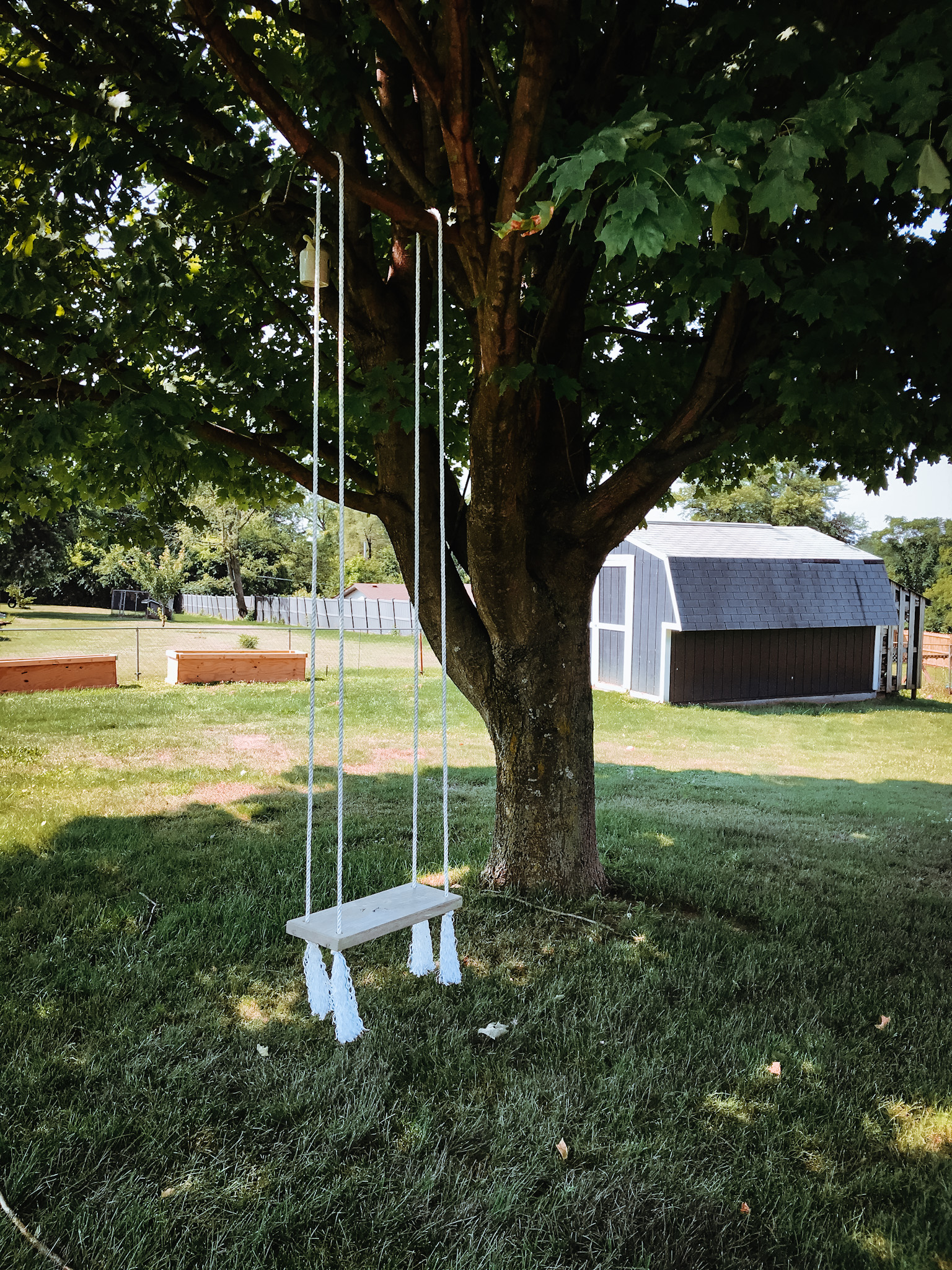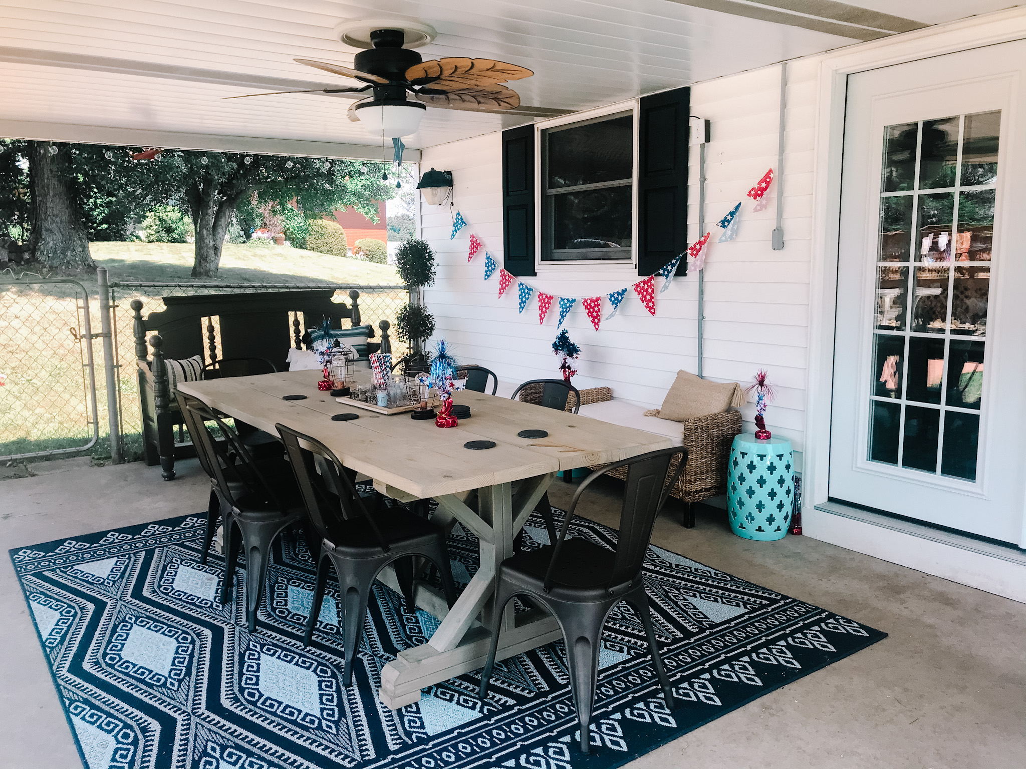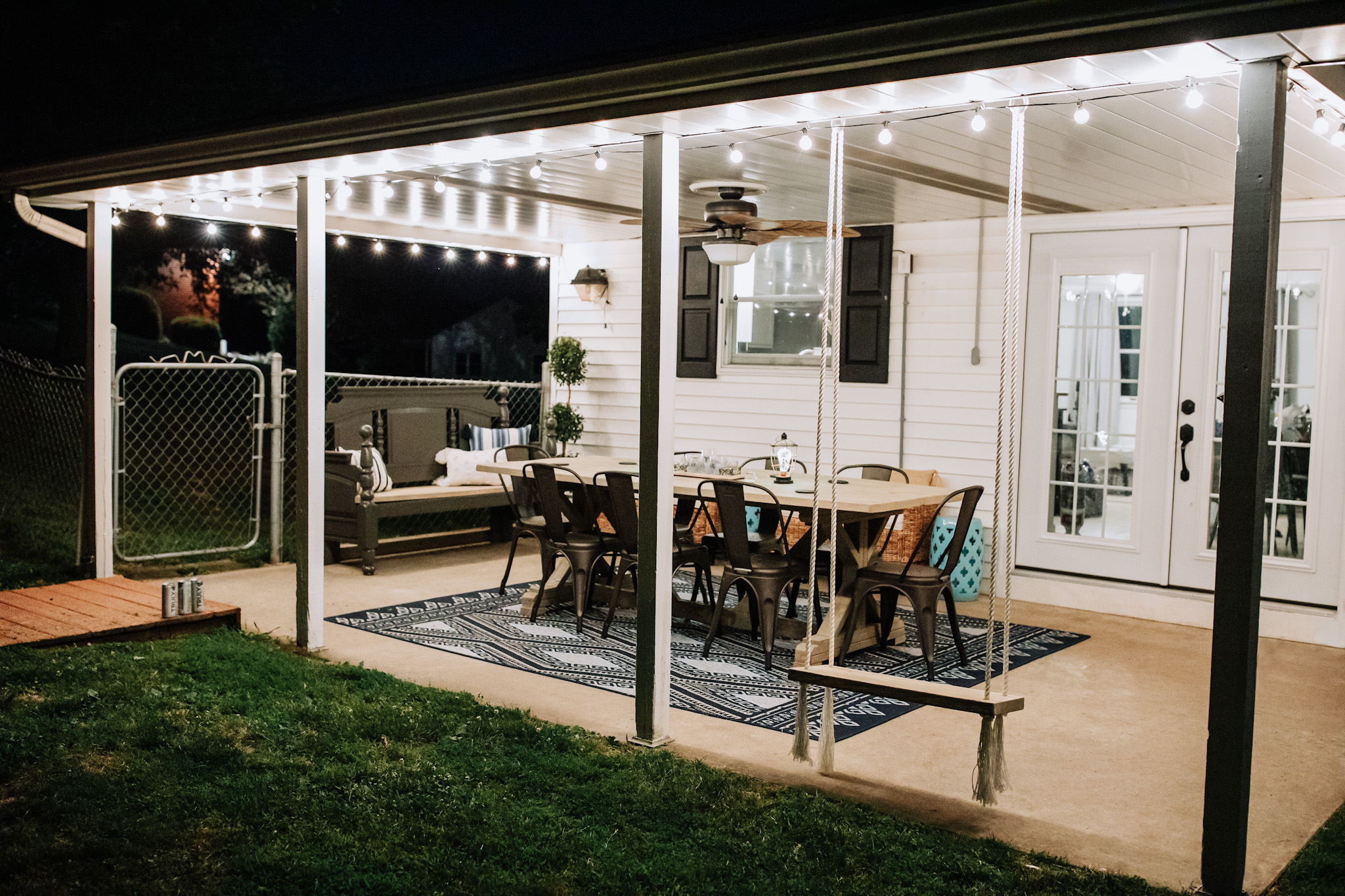 Links to Patio Decor: Indoor/Outdoor Rug, Perfect String Lights, Blue Stripe Tassel Pillow, Ivory Pillow, Woven Pillow, Tan/Brown Pillow, Swing Rope, Outdoor Chairs, The COOLEST Slate Coasters