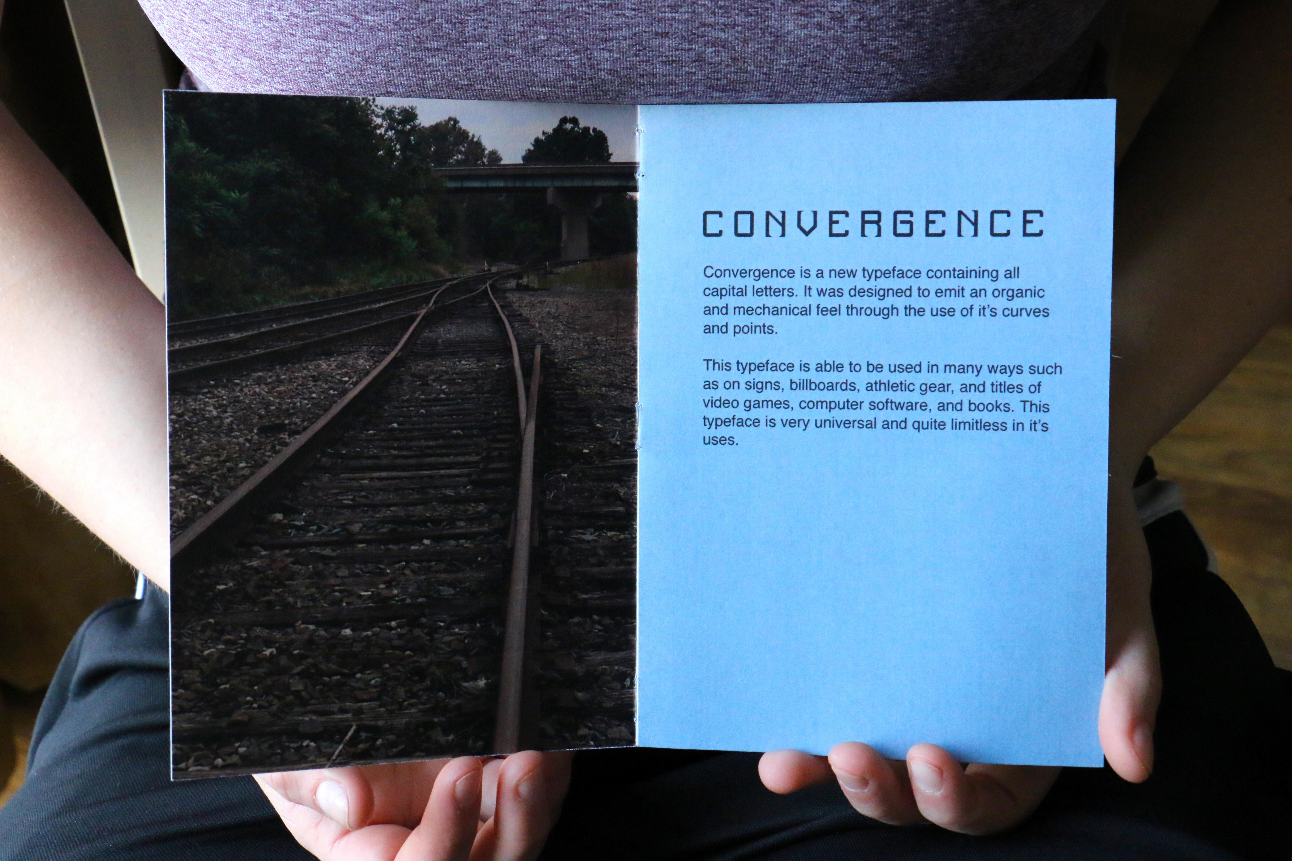 Convergence is a typeface that I created from scratch. I began by sketching and then the final typeface was created using computer software. I wanted it to feel mechanical, but a little bit organic, which is why I used points and curves. This typeface, although it only contains capital letters, is very versatile.