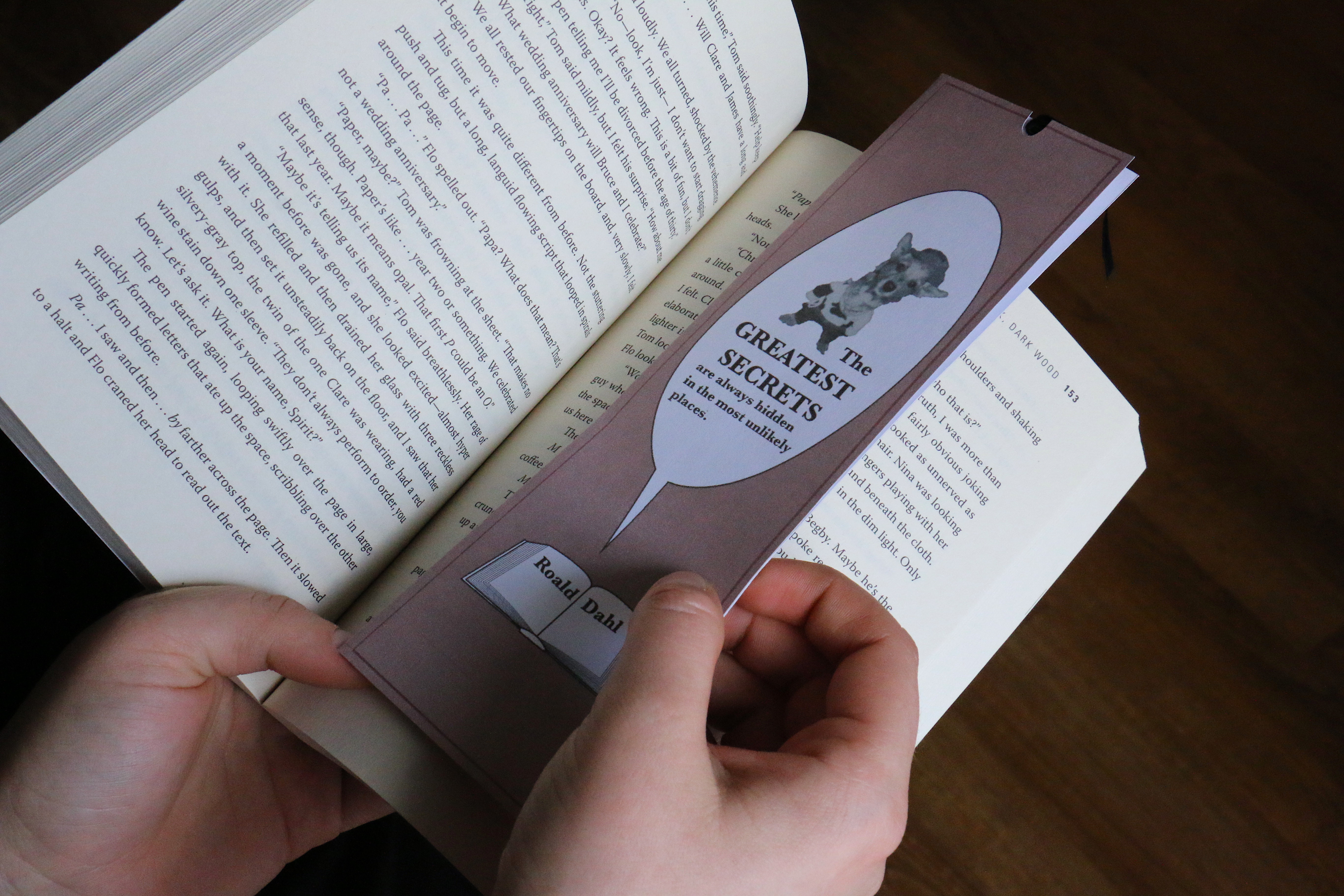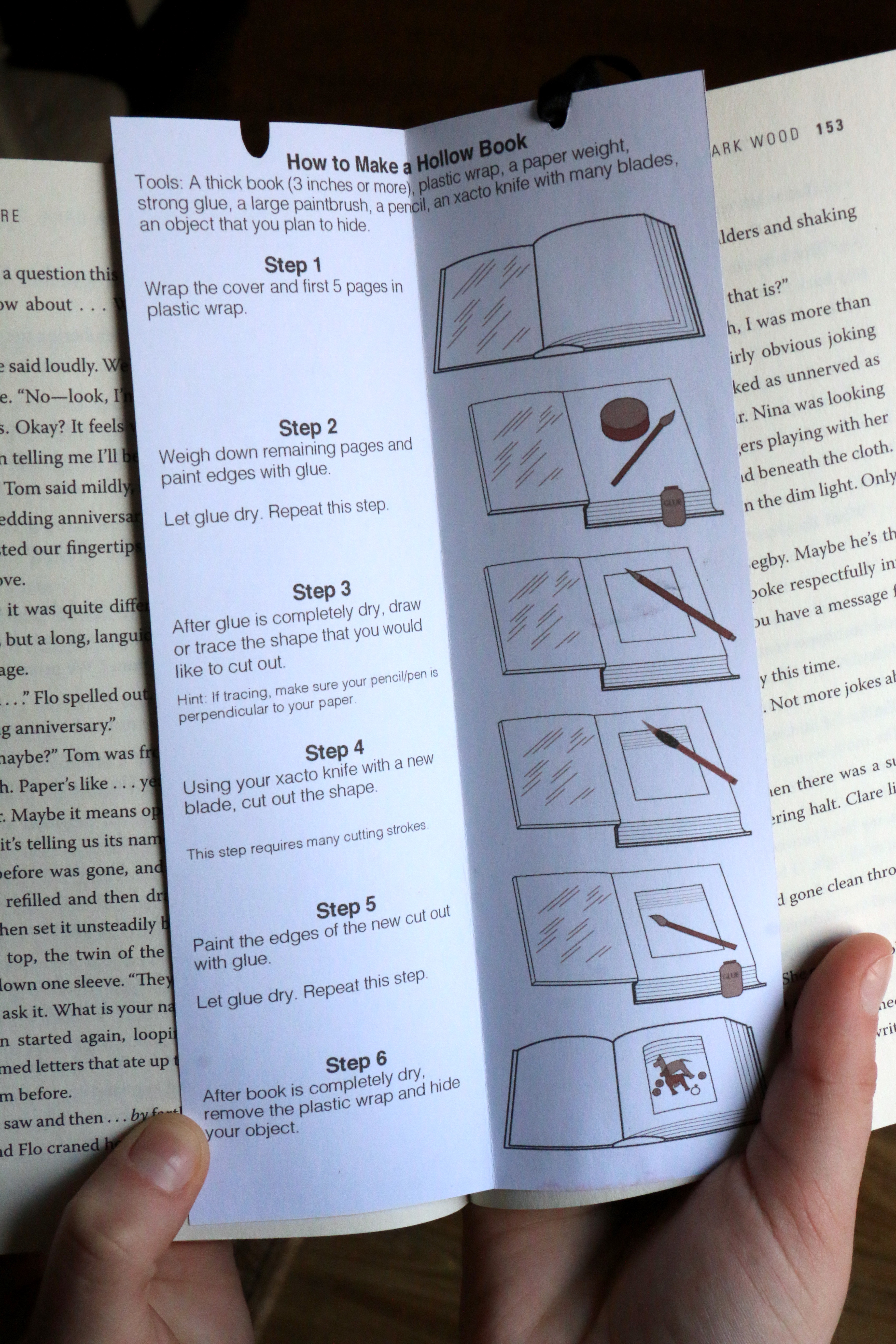 This is an ‘instruction sheet’ on how to make a hollowed out book. I decided to print the instructions into a bookmark that I designed because I thought that would be kind of ironic. You know, a bookmark, in a hollowed out book?!
