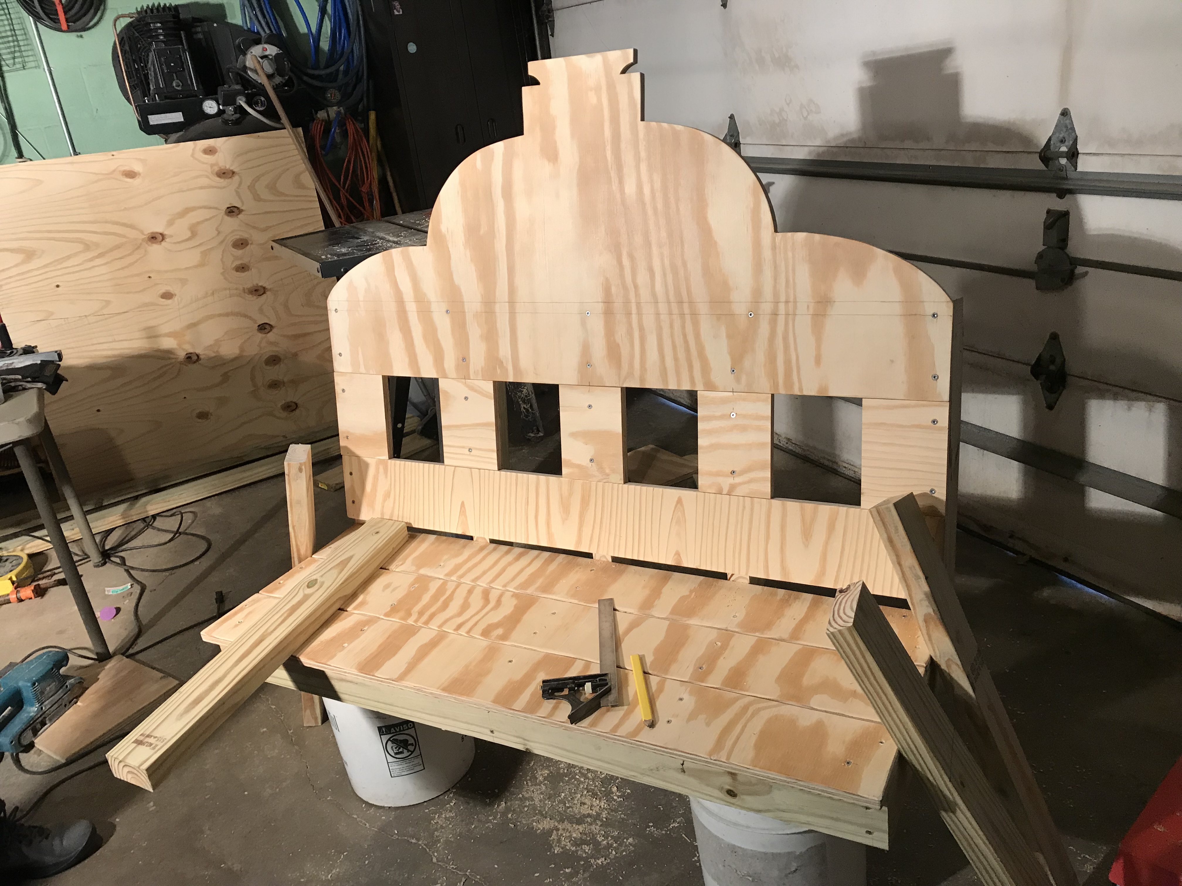 To begin, I created a design in Adobe Illustrator and from there, I used those computer-generated measurements to build the bench. After it was built, I painted it and began the process of getting the metal plates printed. The metal plates are the two blue pieces on the back part of the bench and on the seat. The ornaments on the blue-green part of the bench were done using a vinyl stencil and white spray paint.