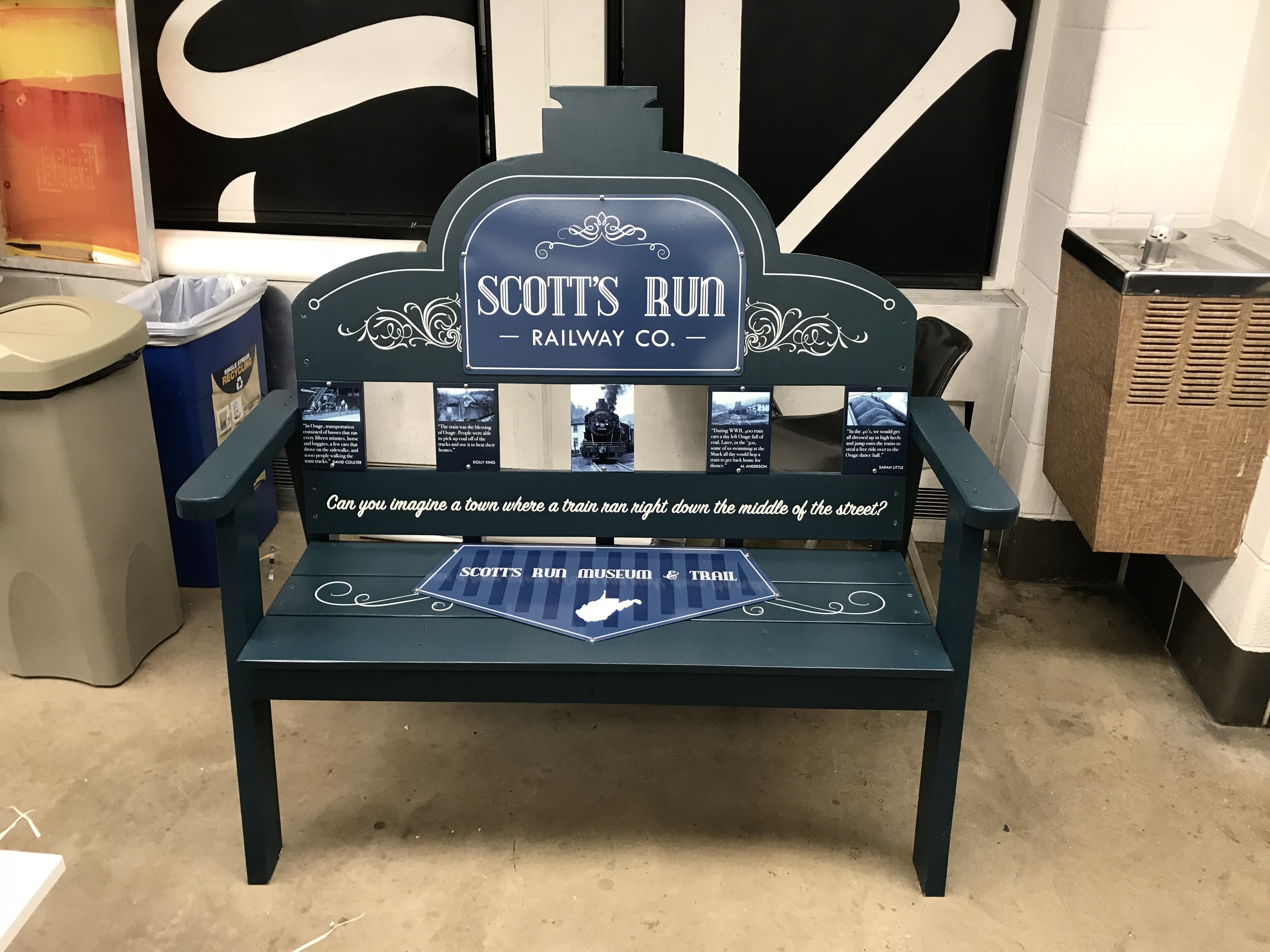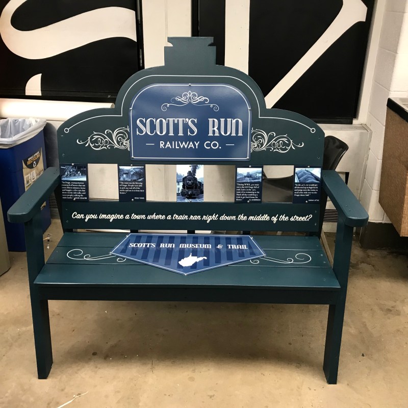Scott’s Run is a small town with a big history. This is a bench that I designed for the Scott’s Run Museum & Trail to commemorate the train that ran right down the center of the main street.